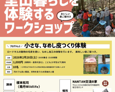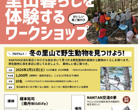 今回「NANTAN交流の家」では、園部地区の暮らし、里山の暮らしに興味のある方を参加対象として、季節を通して、地域資源を使った体験および、身近な素材からのものづくりワークショップを開催します。