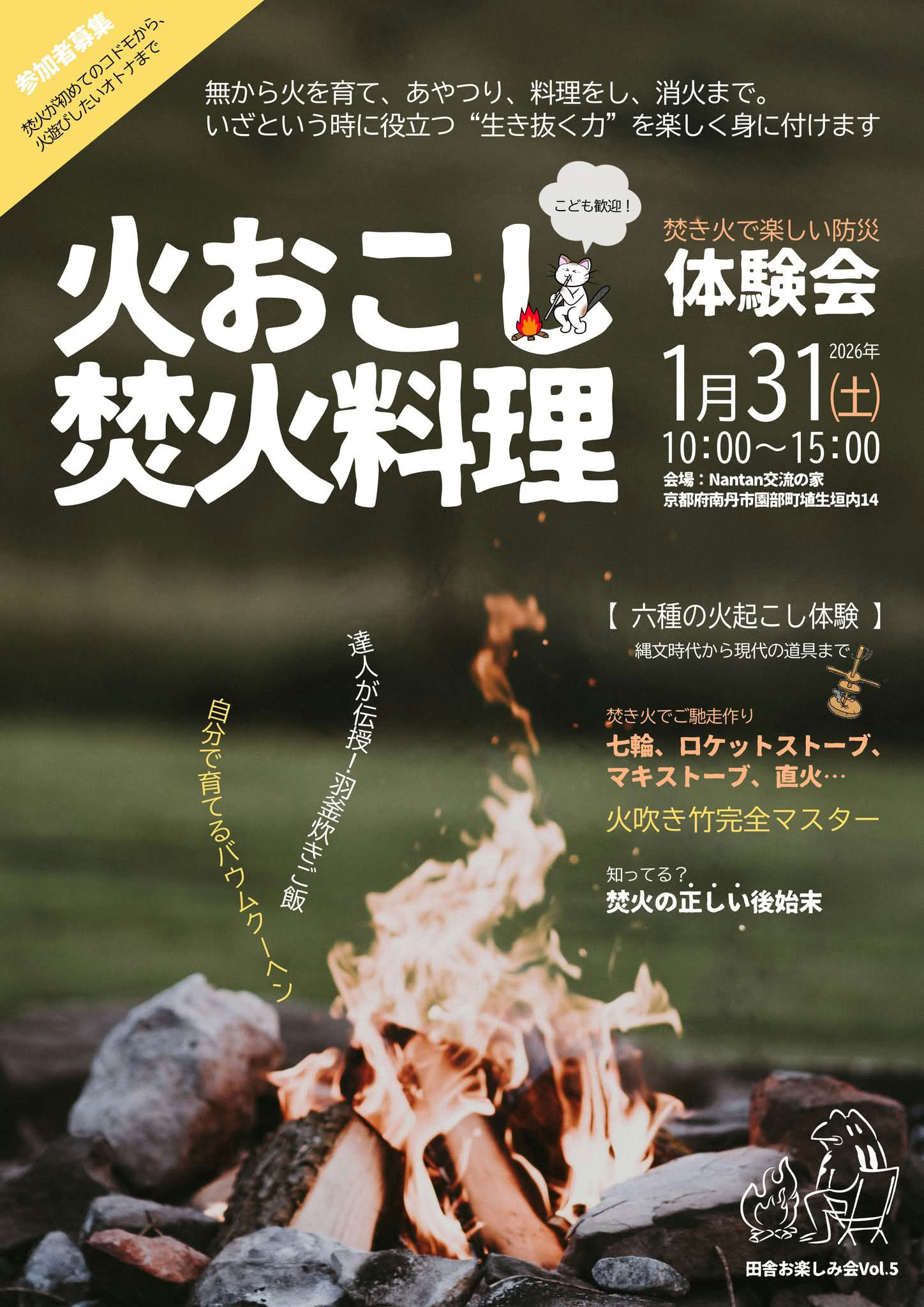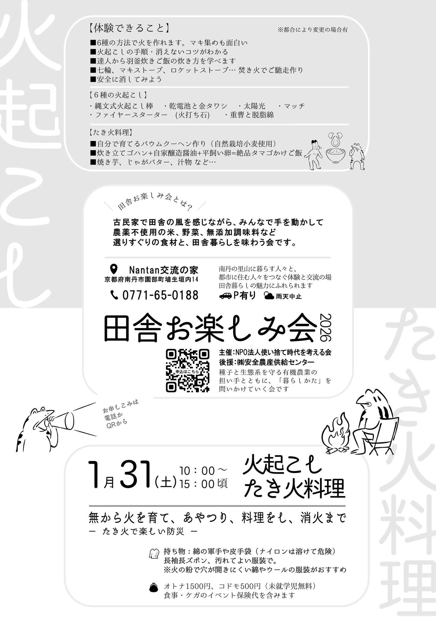 近頃はマッチを擦ることがない、煮炊きするにも火を見ることがないという時代。この際、「火遊び」を企画しようとNANTANスタッフは盛り上がりましたが、火遊びはいくら何でも人聞きが悪い。誤解されそう。むしろ、火を知ってこそ防災につながると、火の起こし方、火の使いかた、火を安全に扱う方法、そんな知恵を学ぶイベントを計画しました。お子さん連れ大歓迎!