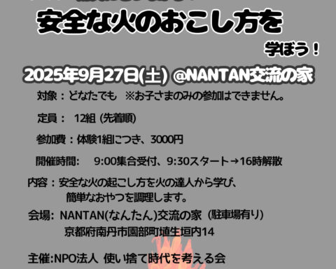 NANTAN·NANTAN交流の家ワークショップ 【開催延期】火のある暮らし:薪ストーブの職人を講師にして、火のおこしかた、調理の仕方などを学ぶワークショップ(2025/9/27) 2025年8月25日 「火のある暮らし」ワークショップは諸事情により開